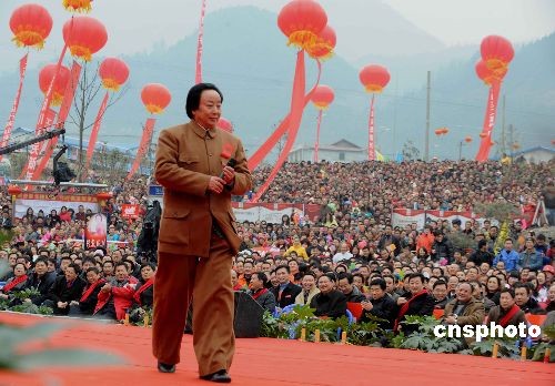 12月31日,扮演“毛主席”的川劇著名演員登臺(tái)看望四川地震極重災(zāi)區(qū)的北川縣擂鼓鎮(zhèn)災(zāi)區(qū)民眾。北川受災(zāi)的上萬民眾在此團(tuán)聚,以迎元旦文藝表演告別難忘的2008年。中新社發(fā) 賈國榮 攝