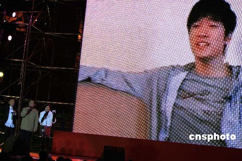 上海:2008年的最后一個(gè)夜晚,劉翔的父親劉學(xué)根(左中)親臨在上海黃浦江畔舉行的可口可樂(lè)“暢爽開(kāi)心年,新春齊分享”新年倒計(jì)時(shí)晚會(huì),并現(xiàn)場(chǎng)與遠(yuǎn)在美國(guó)療傷的劉翔一起,通過(guò)視頻,共唱新年快樂(lè)歌。 中新社發(fā) 潘索菲 攝