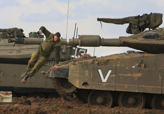 12月31日,在加沙邊境地區(qū),以軍集結(jié)大量坦克和士兵。圖為一名以軍士兵正從一輛坦克上跳下。目前,面對(duì)國(guó)際社會(huì)巨大壓力,以色列仍然拒絕停止對(duì)加沙地帶的大規(guī)模空襲。