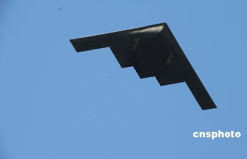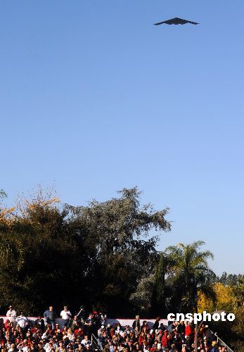 圖為一架美國空軍B-2隱形轟炸機掠過游行隊伍上空,為本屆花車游行助興。中新社發(fā) 張煒 攝