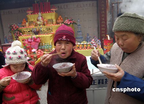 2009年1月3日,農(nóng)歷臘月初八,是中國(guó)傳統(tǒng)的臘八節(jié),湖北宜昌三峽古佛寺里準(zhǔn)備了豐盛的臘八粥,眾多名市民在古佛寺里喜吃臘八粥。據(jù)悉,臘八粥又稱佛粥,與佛祖釋迦牟尼得道成佛有關(guān)。臘八粥在民間被視為吉祥食品,寓意一年之末的大豐收及來(lái)年風(fēng)調(diào)雨順,吉祥如意。中新社發(fā) 劉君鳳 攝