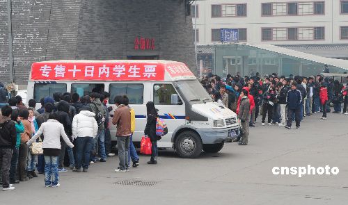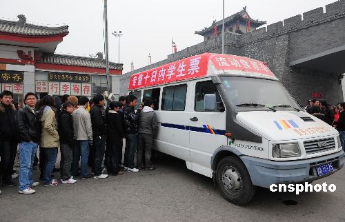 2009年1月5日,學生在西安火車站廣場上的流動售票車前排隊購買火車票。春運臨近,鐵路迎來購票高峰,西安火車站的流動售票車開進車站廣場和大專院校,解決學生購票難題。據(jù)了解,今年春運,西安火車站發(fā)送學生將達到90萬人次,寒假高峰日均學生發(fā)送量3至4萬人,最高日將達6萬人。中新社發(fā) 唐振江 攝