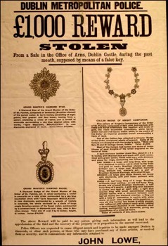 19世紀(jì)愛(ài)爾蘭國(guó)王威廉五世收集了很多珠寶——綠寶石、紅寶石、鉆石,這些珠寶都被安全地放置在都柏林城堡的貝德福德塔里,由阿爾斯特軍事首腦、他的外甥及兩名助手保管。1907年6月18日,教區(qū)牧師稱塔的大門鑰匙不見(jiàn)了。5天之后,一名清潔工在她工作時(shí)發(fā)現(xiàn)大門是開(kāi)的。接著在7月6日,她又發(fā)現(xiàn)了更奇怪的事情:裝滿珠寶的金庫(kù)大門在整晚是敞開(kāi)的。那天下午,牧師和威廉五世的外甥檢查黃金并為圣帕特里克(愛(ài)爾蘭圣徒)的領(lǐng)子裝飾珠寶,這時(shí)一位門童進(jìn)來(lái),牧師將鑰匙交與他并讓他完成剩下的珠寶鑲嵌,一分鐘之后,當(dāng)牧師再次回到金庫(kù)時(shí),他發(fā)現(xiàn)所有的珠寶都不見(jiàn)了!
