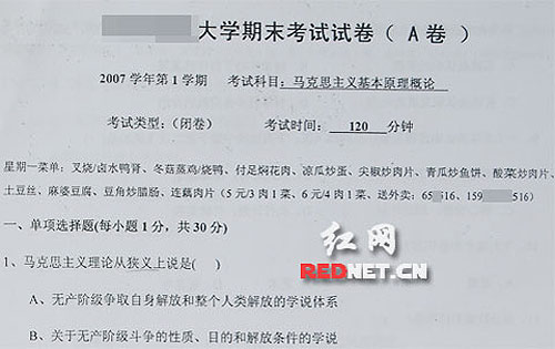“星期一菜單:叉燒鹵水鴨腎,冬菇蒸雞燒鴨……”近日,一篇題為《受不了了!最雷人的大學(xué)試卷印有外賣廣告》的帖子在網(wǎng)上流傳,從帖中圖片可以看到廣州某高校期末試卷每一頁的空白部分印著快餐店的外賣廣告,試卷上顯示的是2007學(xué)年第1學(xué)期,考試科目為馬克思主義基本原理概論。這份“史上最雷人的大學(xué)試卷”立刻成為網(wǎng)友議論的焦點。