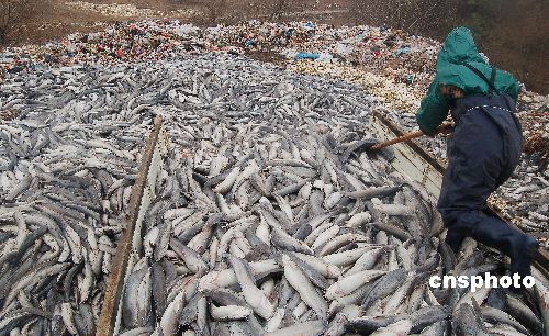 據工人王中友介紹,1月5日凌晨6時,按常規(guī)尋塘時,發(fā)現(xiàn)每個魚池內的鯰魚全部沉入了水底。中午11時左右,沉入水底的鯰魚一個個漂在水面,大片死魚漂滿了魚池,死亡數占95%以上。從1月5日中午開始,汪功兵組織近20人將死魚從魚池中撈上,用兩臺汽車向外裝運。目前每天只能處理5萬斤死魚,大概需要一周時間才能清理完畢。