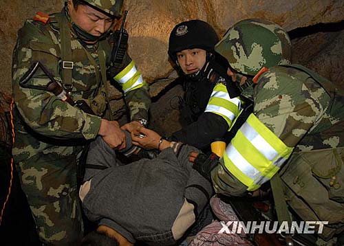 公安干警和武警戰(zhàn)士正在對(duì)山洞中地下兵工廠內(nèi)的犯罪嫌疑人實(shí)施抓捕。劉潺 攝