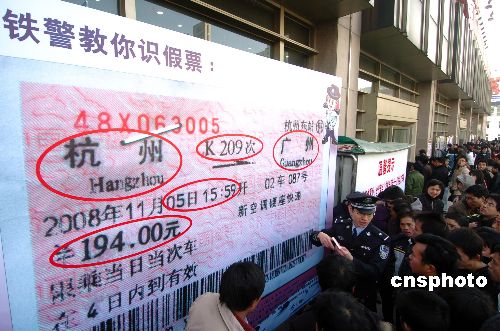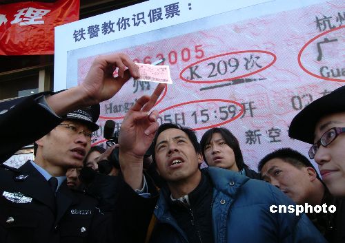 2009年1月10日,杭州鐵路公安處民警在杭州火車站售票處廣場教旅客識別真假火車票。春運期間,杭州鐵路警方針為了防止旅客群眾特別是眾多農(nóng)民工朋友在購票過程中上當受騙,根據(jù)假火車票的原型同比放大50倍制作成假票宣傳展板,在杭州火車站前教授旅客識假票知識。中新社發(fā) 施健學 攝