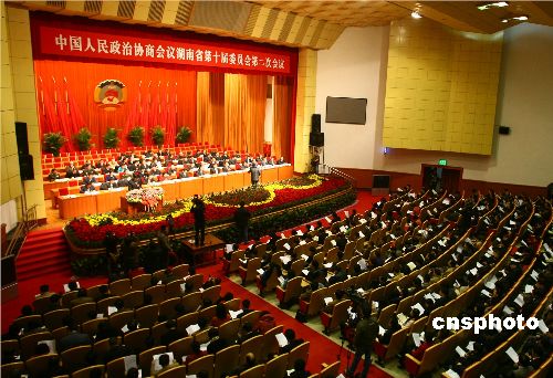 1月10日下午3時(shí),政協(xié)湖南省第十屆委員會(huì)第二次會(huì)議在湖南省軍區(qū)禮堂隆重開幕。來自社會(huì)各界的政協(xié)委員、旁聽代表等共計(jì)700余人與會(huì),將在為期5天的會(huì)議中為湖南發(fā)展建言獻(xiàn)策。中新社發(fā) 傅煜 攝