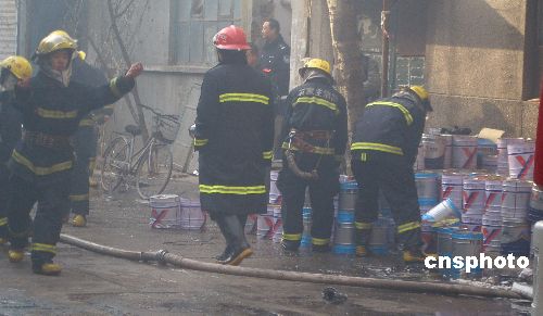 圖為火勢(shì)得到控制后消防人員在濃煙中將一樓倉庫中的大量油漆轉(zhuǎn)移出來。中新社發(fā) 高新國 攝