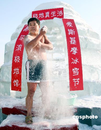 1月12日,“功夫海象”趣味擂臺賽在哈爾濱極地館再敲戰(zhàn)鼓,打破吉尼斯世界耐寒紀錄的“冰人”金松浩也參加其中。他與“功夫海象”耶娃在冰冷刺骨的海水中耐寒比拼長達一個多小時。最叫絕的是金松浩躺在零下30多度的冰床上與“功夫海象”一起比試仰臥起坐,這樣的場面令人驚嘆不已。來自哈市的6個家庭及松花江冬泳隊的6名成員也與“功夫海象”耶娃展開激烈角逐。他們在哈爾濱極地館的“愛斯基摩村”里爬冰堡、拉爬犁;三九天在戶外大口大口吃冰棍、啃凍梨、嚼冰糖葫蘆。真是笑傲冰雪,妙趣橫生。中新社發(fā) 姚庭山 攝