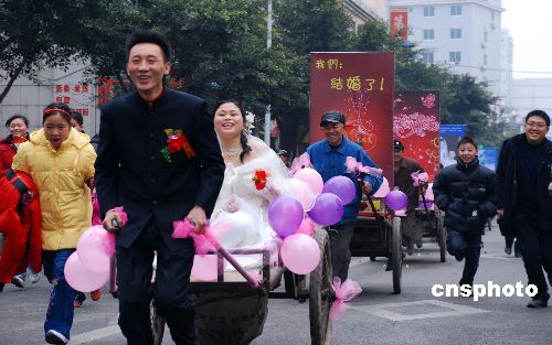 1月13日上午,一支由新郎拉著板車載著新娘的板車迎親隊(duì),浩浩蕩蕩經(jīng)過重慶梁平縣城,沿途向行人撒喜糖、紅包,然后奔向新家。這支新穎、獨(dú)特的迎親板車隊(duì),引得沿途行人駐足觀看,許多汽車主動(dòng)停下讓道,并鳴笛向他們祝賀。沿途許多市民對(duì)他們這場(chǎng)婚禮贊不絕口,送上對(duì)新人的祝福。新郎周剛介紹,新娘黃林鳳家住廣西來濱市,她愿從那么遠(yuǎn)的地方嫁過來,讓他很感動(dòng),就想以一種特別的方式娶她,因此請(qǐng)人策劃了這場(chǎng)婚禮。新郎稱,租汽車需花2000元左右,租10輛板車只花了400元,用板車比汽車節(jié)約,其實(shí)節(jié)約這點(diǎn)錢對(duì)他們來說不算什么,但主要的是這種形式終身難忘,要的是倡導(dǎo)婚事新辦節(jié)約。當(dāng)天他們向行人撒了約5公斤喜糖,撒了200個(gè)、內(nèi)裝2元錢紅包。中新社發(fā) 木文 攝