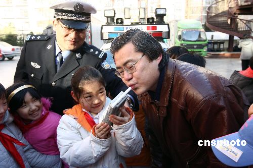 1月14日,北京崇文區(qū)交通支隊(duì)民警為崇文小學(xué)學(xué)生和家長(zhǎng)講授交通安全課,家長(zhǎng)當(dāng)場(chǎng)向自己的孩子簽署交通安全承諾書(shū),承諾在節(jié)日期間不酒后駕車、不闖紅燈、不疲勞駕駛,與孩子度過(guò)安全、快樂(lè)的假期。圖為小學(xué)生學(xué)習(xí)用酒精監(jiān)測(cè)儀測(cè)試自己的家長(zhǎng)。中新社發(fā) 杜洋 攝