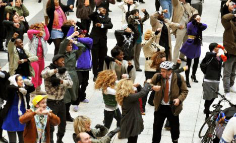 跳舞的人群中既有前來英國觀光的旅行者,也有地鐵站的工作人員,他們在一瞬間聚集,有組織的表演hip-pop、迪斯科或者舞廳舞步動(dòng)作,幾分鐘后又都忽然解散。