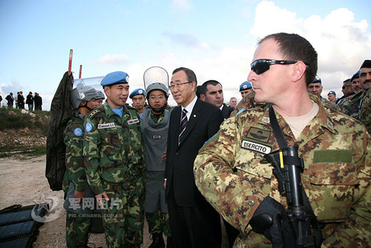 黎巴嫩當?shù)貢r間17日,正在中東進行外交斡旋的聯(lián)合國秘書長潘基文在視察聯(lián)合國駐黎巴嫩維和部隊時,專程前往藍線接見了中國赴黎維和工兵營掃雷官兵。