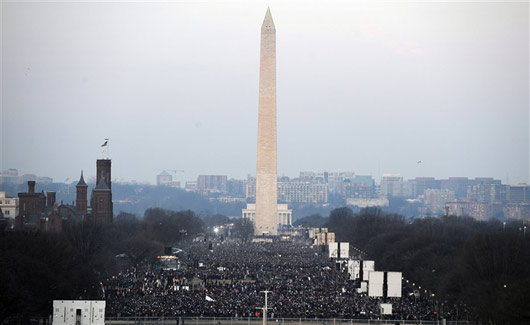 美國(guó)當(dāng)?shù)貢r(shí)間1月20日上午,華盛頓林肯紀(jì)念堂前的國(guó)家大草坪上擠滿了前來參加奧巴馬就職典禮的民眾。