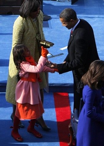 奧巴馬的小女兒薩莎在父親宣誓后豎起大拇指。
