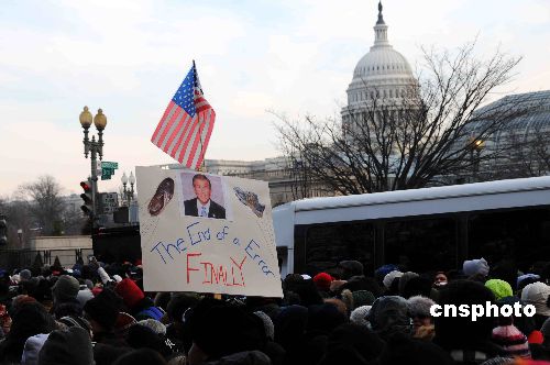 圖為在國(guó)家大草地的觀禮民眾打出布什被扔鞋的窘相并寫(xiě)著:“錯(cuò)誤的最后終結(jié)”!中新社發(fā) 邱江波 攝