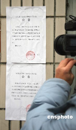 圖為法院門口張貼關(guān)于下午兩點開庭宣判三鹿集團(tuán)及田文華等生產(chǎn)、銷售偽劣產(chǎn)品一案和張玉軍、張彥章以危險方法危害公共安全案的公告。中新社發(fā) 翟羽佳 攝