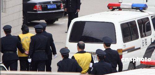 圖為耿金平等犯罪嫌疑人被從后門押送進(jìn)入法院。中新社發(fā) 翟羽佳 攝