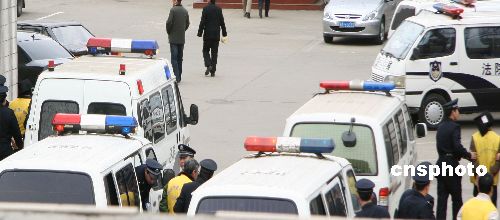 圖為當(dāng)日中午,接押張玉軍、張彥章等人的警車駛回法院后院,法警押送嫌疑人進(jìn)入法院。中新社發(fā) 翟羽佳 攝