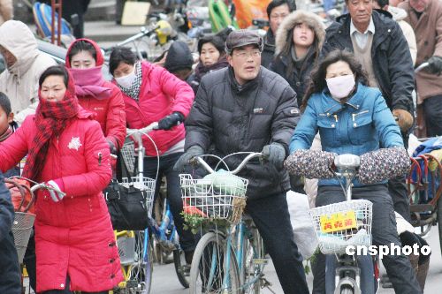 2009年1月22日,江蘇省贛榆縣市民在寒風中出行。受強冷空氣東移南下影響,江蘇全省迎來強降溫寒潮天氣,蘇北沿海溫度最低降至零下8攝氏度以下,風力9~10級。當?shù)貧庀蟛块T發(fā)布寒潮黃色預警信號,并提醒有關單位和個人做好防寒保暖和防風工作。中新社發(fā) 司偉 攝