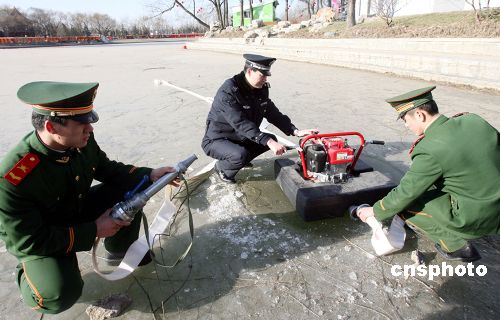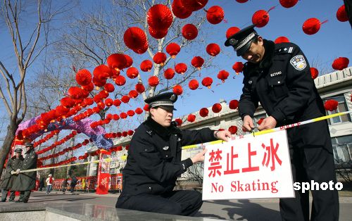 1月22日,北京崇文警方會(huì)同相關(guān)部門(mén)對(duì)龍?zhí)逗䦶R會(huì)的各項(xiàng)公眾措施進(jìn)行最后檢查,以確保游人的絕對(duì)安全。中新社發(fā) 胡建強(qiáng) 攝