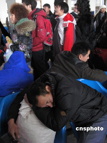 1月23日,一批批的旅客從北京站登車(chē)回鄉(xiāng)過(guò)農(nóng)歷已丑年(牛年)的春節(jié)。一名辛苦一年的壯年民工,在候車(chē)大廳等車(chē)中,提早進(jìn)入了新春的夢(mèng)鄉(xiāng)。為回鄉(xiāng)過(guò)農(nóng)歷已丑年(牛年)的春節(jié),許多在北京的旅客,早早離開(kāi)臨時(shí)居所,在車(chē)站休息。當(dāng)日是中國(guó)春運(yùn)第13天,中國(guó)客流最高峰已經(jīng)到來(lái),中國(guó)鐵路共開(kāi)行臨客754列,其中直通臨客393列。中新社發(fā) 鄒憲 攝