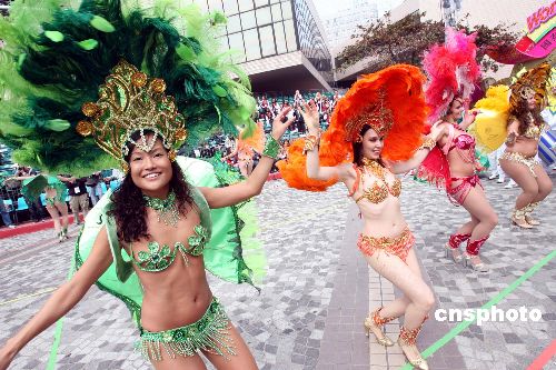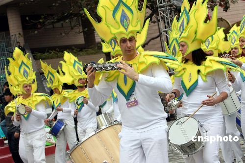 一月二十五日,前來香港參加新春國際匯演之夜的多支隊(duì)伍在文化中心廣場(chǎng)進(jìn)行彩排,丹麥桑巴舞演員身穿華麗舞衣,配合熱情奔放的音樂,點(diǎn)燃現(xiàn)場(chǎng)歡樂氣氛。由香港旅發(fā)局主辦的“2009國泰航空新春國際匯演之夜”將在大年初一晚舉行。中新社發(fā) 洪少葵 攝