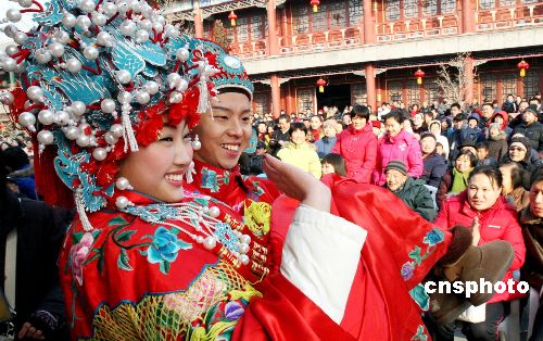 1月27日 (大年初二),北京大觀園十四屆紅樓廟會吸引眾多假日游客,本屆廟會以弘揚(yáng)中華傳統(tǒng)文化為宗旨,以展現(xiàn)紅樓文化為主題,呈現(xiàn)出改革開放30年來新北京、新宣武的精神風(fēng)貌。廟會主要活動有“元妃省親”、“寶黛成婚”“賈母賀壽”、紅樓文化展覽--木版年畫展、紅樓夢人物火花展以及紅樓美食展示區(qū)等。圖為在北京大觀園2009年紅樓廟會上別具創(chuàng)意的“寶黛成婚”。中新社發(fā) 錢興強(qiáng) 攝