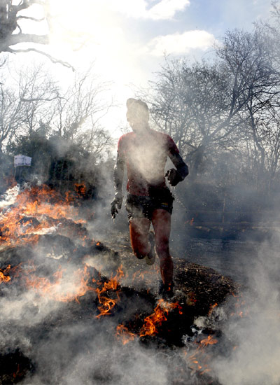 硬漢大賽:一年一度的英國(guó)硬漢挑戰(zhàn)大賽在英格蘭中部的伍爾弗漢普頓市舉行,共有接近3000名選手參加這項(xiàng)被譽(yù)為叢林戰(zhàn)士的賽事。參賽者需要在火焰中奔跑,穿越齊腰深的沼澤地,在帶刀片的鐵絲網(wǎng)下爬行,躍入冰冷的湖中……