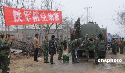 二月六日上午,駐豫六百多名解放軍官兵專程趕赴民眾吃水困難的河南省新鄭市辛店鎮(zhèn)李莊村,將“甘霖”送入民眾家中。二00八年十一月以來,河南省氣偏高,干旱少雨,遭受自一九五一年以來的特大旱情,農(nóng)作物受旱面積達到百分之六十三點一,四千一百多萬畝麥田受旱災(zāi),部分地區(qū)出現(xiàn)臨時性人畜飲水困難。