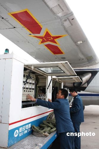 官兵為增雨飛機(jī)補(bǔ)充電源。