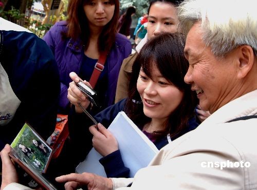 2月11日,一名大熊貓志愿者在福州熊貓世界向前來拍攝大熊貓專題片的臺灣電視臺攝制組人員,展示他本人珍藏的蓋有臺北郵戳的大熊貓“團(tuán)團(tuán)”“圓圓”明信片。