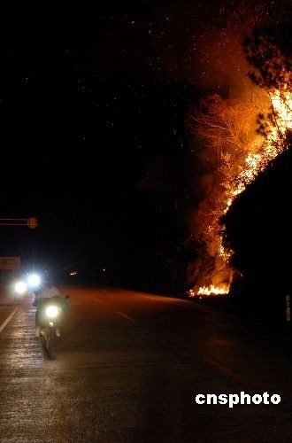 圖為高砂鎮(zhèn)境內的公路上,來往的車輛從火叢旁穿流而過。中新社發(fā) 李劍準 攝