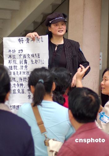 圖為一位媽媽手持簡介在賣力地推介自己的“好青年”兒子,吸引眾多相親人士。中新社發(fā) 劉萬強 攝