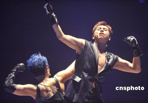 二月十四日晚,“香港二零零九東亞運(yùn)動會.左麟右李演唱會”在香港紅磡體育館作尾場演出。圖為歌星譚詠麟、李克勤特別為是次演唱會強(qiáng)身,兩人演出時不忘展示麒麟臂及胸肌。 中新社發(fā) 鄧慶樂 攝