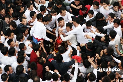 2月16日,農(nóng)歷正月二十二,廣東汕頭市鹽灶村舉行獨(dú)特的傳統(tǒng)“搶財(cái)神”活動(dòng);顒(dòng)中,一些被挑選出來的村民將廟里的神像抬出來游行,其他村民則競相涌上前觸摸甚至奪取、拖行神像。按照村里的老話:“老爺公喜歡拖,越拖越興旺!边@一獨(dú)特盛會(huì)吸引了數(shù)千人前來助威觀看,比過春節(jié)還熱鬧。