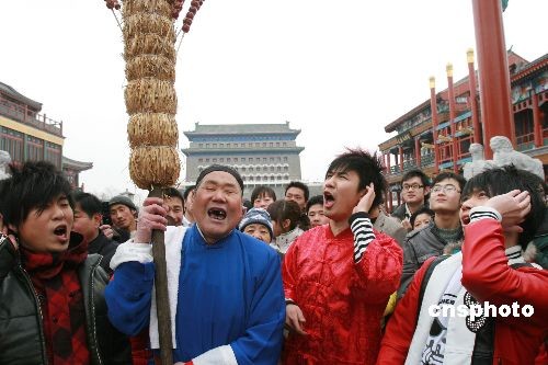 2009年2月17日,遼寧衛(wèi)視在北京前門大街步行街拍攝反映老北京民俗節(jié)目的現(xiàn)場(chǎng),花兒樂(lè)隊(duì)的成員向“京城叫賣大王”臧鴻學(xué)習(xí)“老北京叫賣”絕活,吸引了眾多游客駐足觀看。中新社發(fā) 陳曉根 攝
