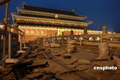 2月18日,為迎接新中國成立60周年,天安門管委會從當日起對金水橋?qū)嵤┍Wo修繕。據(jù)悉,此次修繕工作將分階段進行,由于施工圍擋防火板高度有限,因此金水橋和天安門城樓的整體景觀和游覽不會受到太大影響。工程擬于2009年5月1日前完工,并整體對外開放。中新社發(fā) 鄭雄增 攝