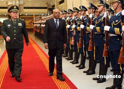 2月19日下午,國務(wù)委員兼國防部長梁光烈上將在北京八一大樓與來訪的馬爾代夫國防與國家安全部長費(fèi)薩爾舉行會談,會談前梁光烈上將陪同費(fèi)薩爾檢閱解放軍三軍儀仗隊(duì)。中新社發(fā) 宋吉河 攝