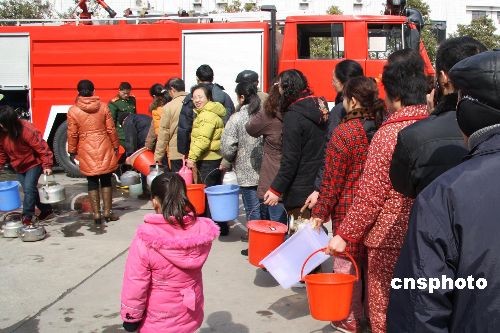 2月21日,江蘇省鹽城市各主干道上,消防車輛正為市民輸送安全用水,確保鹽城市民能夠安心喝上未被污染的自來水。由于水廠受酚類化合物污染,鹽城市區(qū)2月20日出現(xiàn)大面積停水,居民生活受到較大影響。造成本次停水的水源地污染原因已經(jīng)確認(rèn),偷排污水的鹽城標(biāo)新化工有限公司被責(zé)令關(guān)閉,法人代表等相關(guān)責(zé)任人被采取強(qiáng)制措施。圖為鹽城市市委黨校內(nèi)排隊(duì)等待取水的市民。中新社發(fā) 童盛 攝