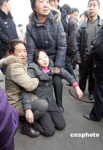 山西焦煤集團(tuán)屯蘭礦“2·22”特大瓦斯爆炸事故新聞中心,2月23日中午舉行第四次新聞發(fā)布會。據(jù)通報(bào),目前事故的搜救工作已經(jīng)基本結(jié)束,事故賠償工作正在有序進(jìn)行。目前事故已造成74人遇難,114人住院觀察、治療。5名危重傷員當(dāng)中,有3人生命體征恢復(fù)正常,另外2人未脫離危險(xiǎn)。事故賠償標(biāo)準(zhǔn)為每人不低于20萬元人民幣。由于每個(gè)礦工都投了工傷保險(xiǎn)和工傷意外保險(xiǎn),保險(xiǎn)部門正根據(jù)他們的投保情況進(jìn)行理賠。圖為傷心萬分的礦工家屬。