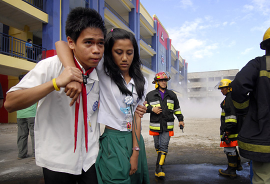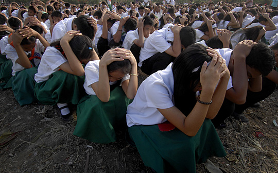 2月27日,在菲律賓大馬尼拉區(qū)的奎松城,參加地震演練的中學生們蹲在開闊地帶用雙手護住頭部,同時他們的同學在協(xié)助消防部門救助“傷員”。菲律賓在全國范圍內(nèi)舉行地震演練,以提高抵御災害的能力和突發(fā)事件救援的反應速度。