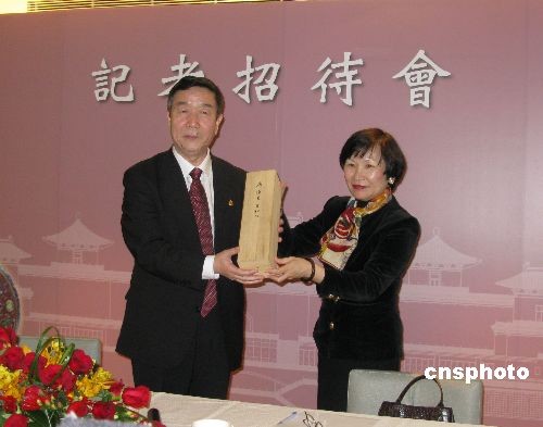 3月2日下午,臺北故宮博物院與北京故宮博物院代表在臺北故宮博物院,就2月15日雙方在北京達(dá)成的共識舉行進(jìn)一步會談,并在會后召開記者會,發(fā)表落實合作交流方案,雙方同意在不涉及名稱載示及法令之前提下,進(jìn)行8項實質(zhì)性合作。根據(jù)落實方案,今年故宮兩院將舉辦首屆學(xué)術(shù)研討會并每年于7月至9月互訪、互贈新出版品,互派人員駐訪2至3個月,協(xié)商互設(shè)商品柜臺,臺北故宮今年舉辦的雍正特展向北京故宮借展27組(37件)文物等。圖為臺北故宮博物院院長周功鑫(右)向北京故宮博物院院長鄭欣淼(左)贈送唐代懷素《自敘帖》的高仿真復(fù)制品。中新社發(fā) 路梅 攝