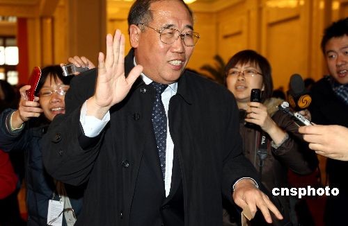 3月3日下午,國家發(fā)改委副主任解振華在參加全國政協(xié)十一屆二次會議開幕會時,被媒體圍堵熱問節(jié)能減排問題。中新社發(fā) 傅丹丹 攝