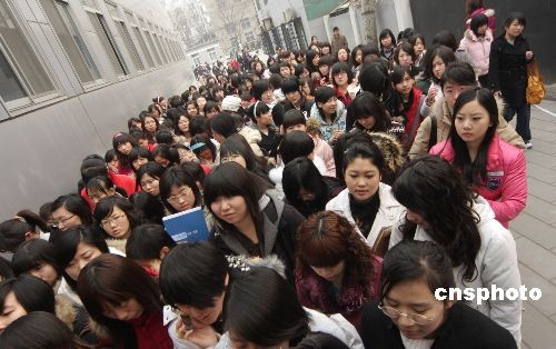 2009年3月4日,前來(lái)應(yīng)聘的女大學(xué)生擠滿了會(huì)場(chǎng)!叭恕眹(guó)際婦女節(jié)前夕,北京市2009年女大學(xué)生專場(chǎng)招聘會(huì)在北京市畢業(yè)生就業(yè)市場(chǎng)舉辦,吸引了數(shù)萬(wàn)女大學(xué)生到場(chǎng)應(yīng)聘。中新社發(fā) 吳芒子 攝