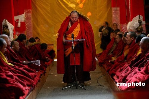 3月4日,藏歷新年正月初八,拉薩色拉寺舉行傳昭大法會(huì),僧人們會(huì)進(jìn)行傳統(tǒng)的辯經(jīng)、祈愿、頌經(jīng)等佛事活動(dòng)。每年的傳昭大法會(huì)從藏歷正月初八開始,持續(xù)到藏歷正月十五。圖為在色拉寺大殿內(nèi)高僧在進(jìn)行誦經(jīng)。中新社發(fā) 劉震 攝