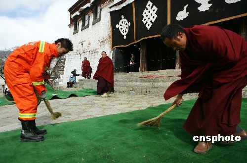 3月4日,藏歷新年正月初八,拉薩色拉寺舉行傳昭大法會(huì),僧人們會(huì)進(jìn)行傳統(tǒng)的辯經(jīng)、祈愿、頌經(jīng)等佛事活動(dòng)。每年的傳昭大法會(huì)從藏歷正月初八開始,持續(xù)到藏歷正月十五。圖為色拉寺消防大隊(duì)的士兵在辯經(jīng)前協(xié)助僧人清潔辯經(jīng)現(xiàn)場(chǎng)。中新社發(fā) 劉震 攝