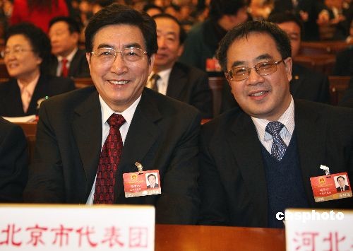 3月5日上午,十一屆全國(guó)人大二次會(huì)議在北京人民大會(huì)堂開幕,先后在西藏工作過的的北京市市長(zhǎng)郭金龍(左)、河北省省長(zhǎng)胡春華出席大會(huì)時(shí)比鄰而坐。中新社發(fā) 任晨鳴 攝