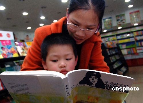 三月五日是中國(guó)“學(xué)雷鋒日”,福州一年輕母親在圖書(shū)城為兒子翻閱少兒版《穿越時(shí)空的雷鋒》一書(shū)。中新社發(fā) 劉可耕 攝